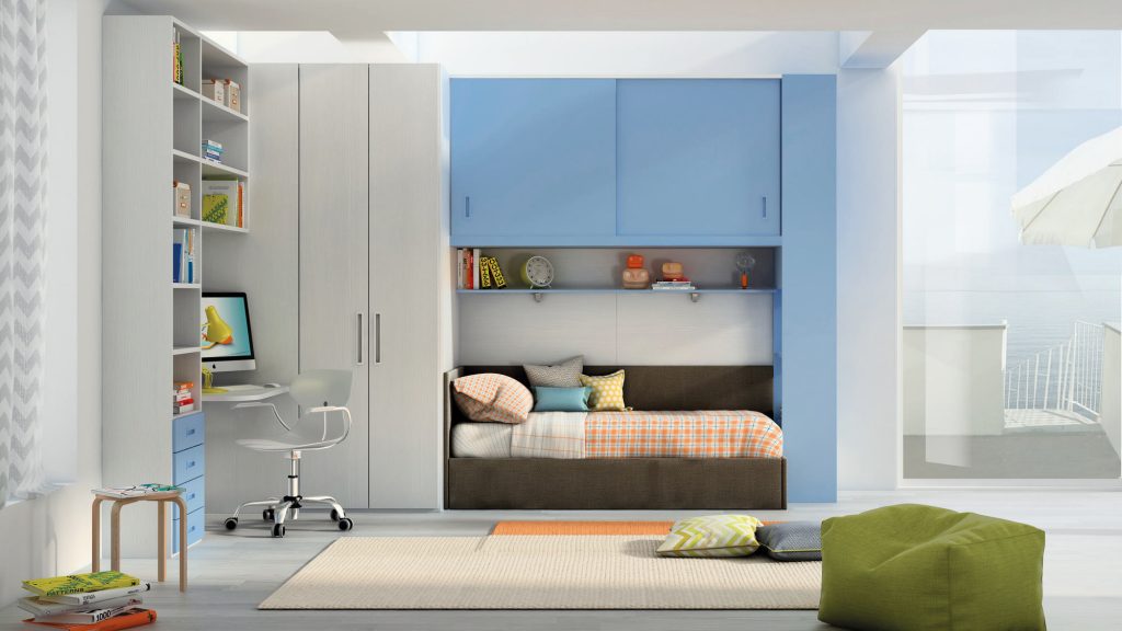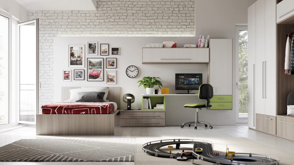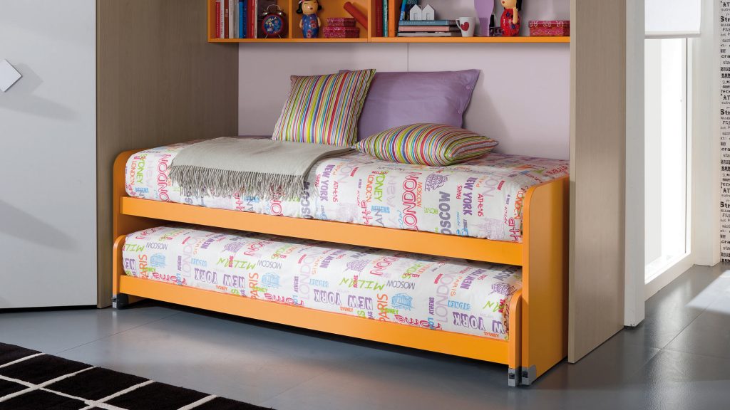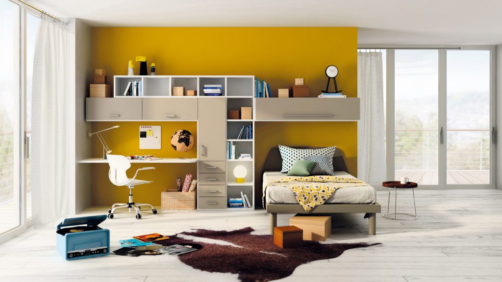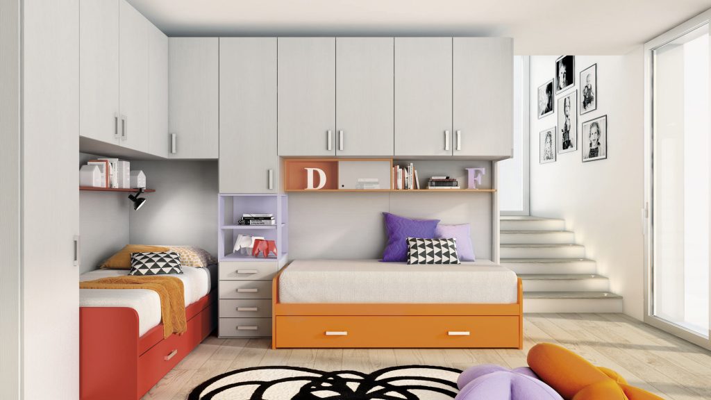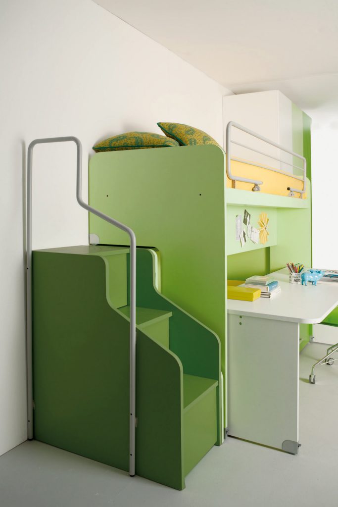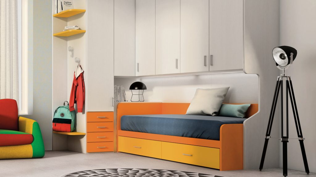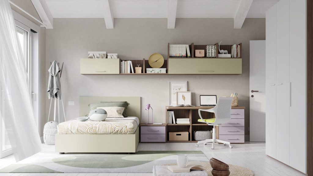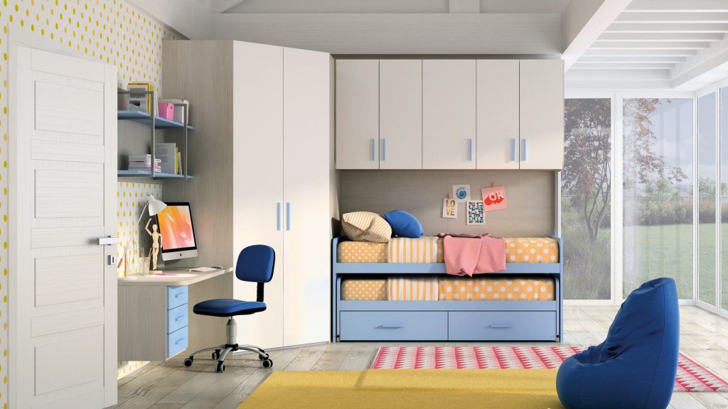 I letti si trasformano: diventano più grandi, contenitori, con possibilità di estrarre un secondo letto per un pigiama party con gli amichetti. Tutto è studiato per accompagnare il bambino nella transizione verso una crescente autonomia: dal riporre i vestiti all’organizzare la cartella.