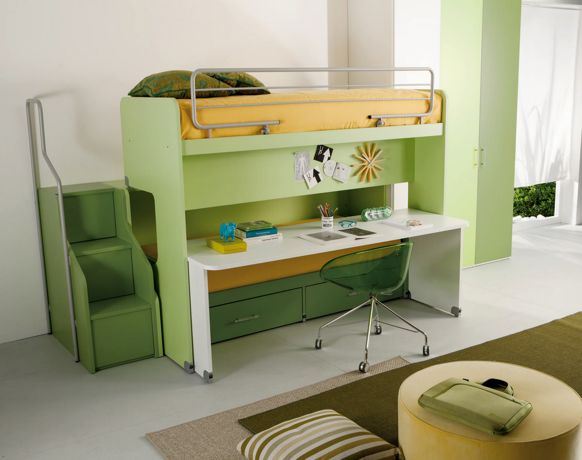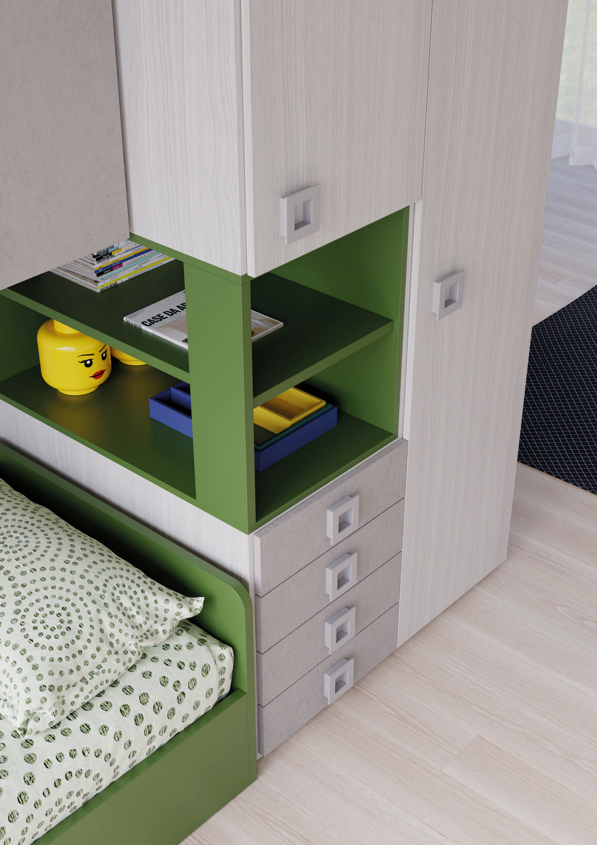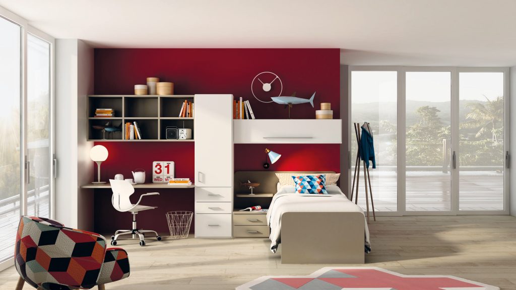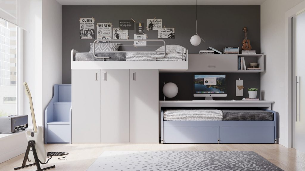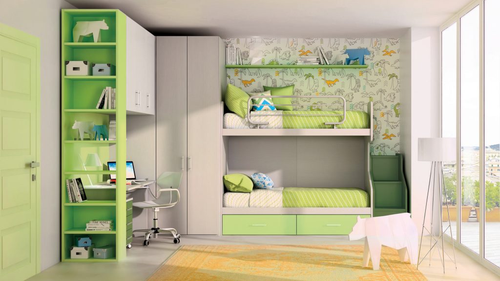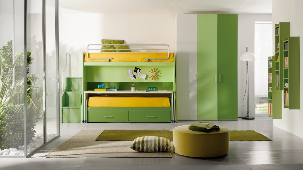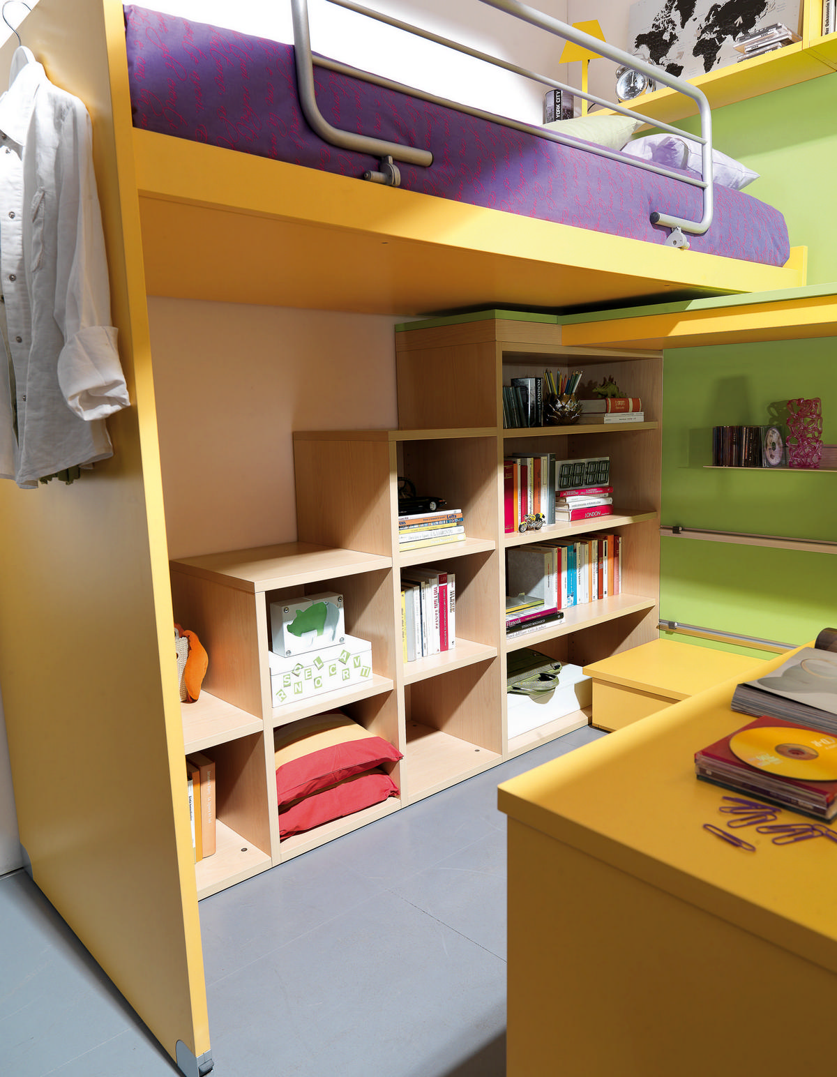 I letti si trasformano: diventano più grandi, contenitori, con possibilità di estrarre un secondo letto per un pigiama party con gli amichetti. Tutto è studiato per accompagnare il bambino nella transizione verso una crescente autonomia: dal riporre i vestiti all’organizzare la cartella.
