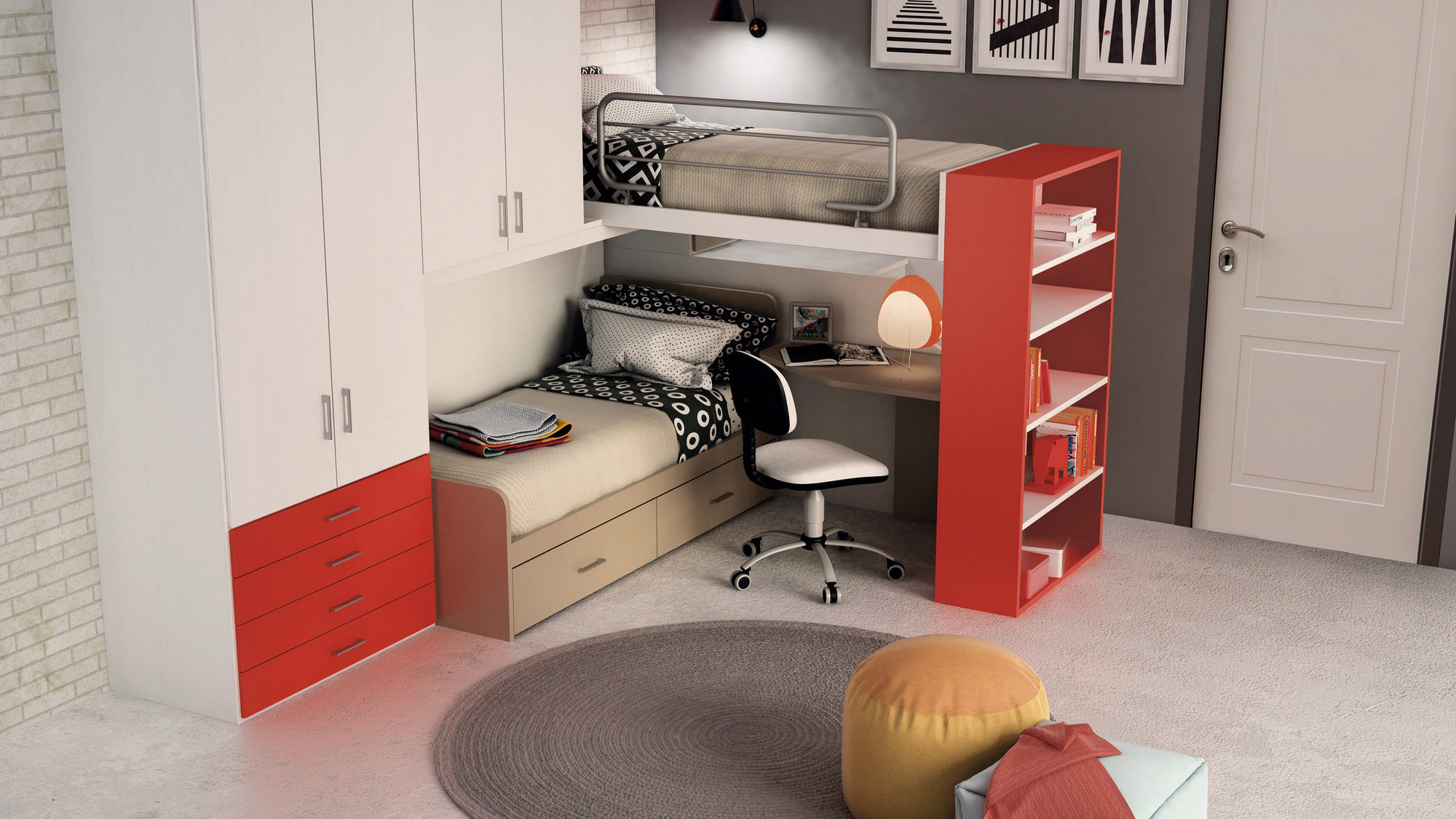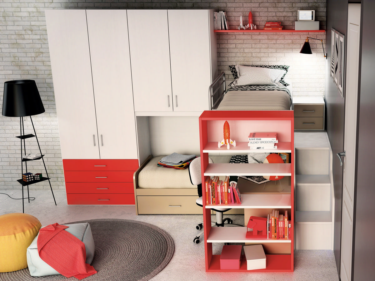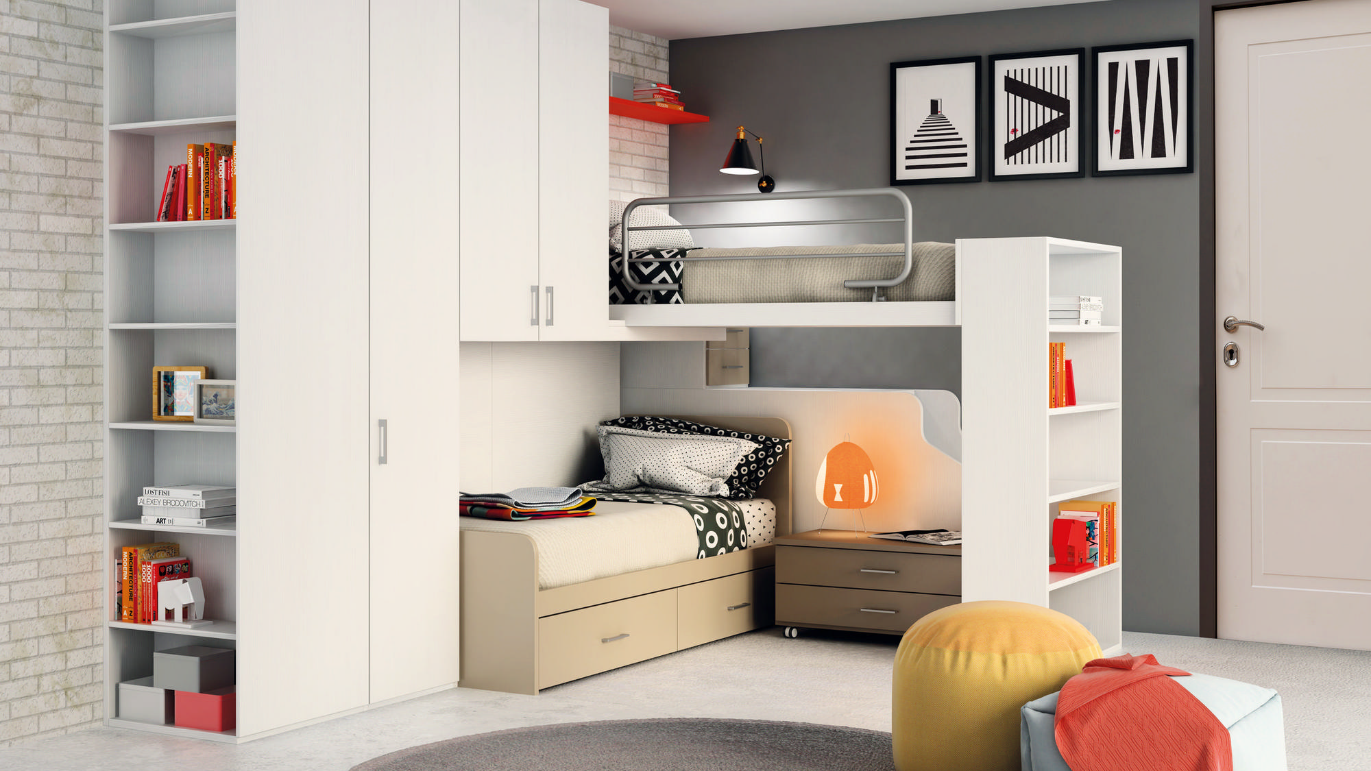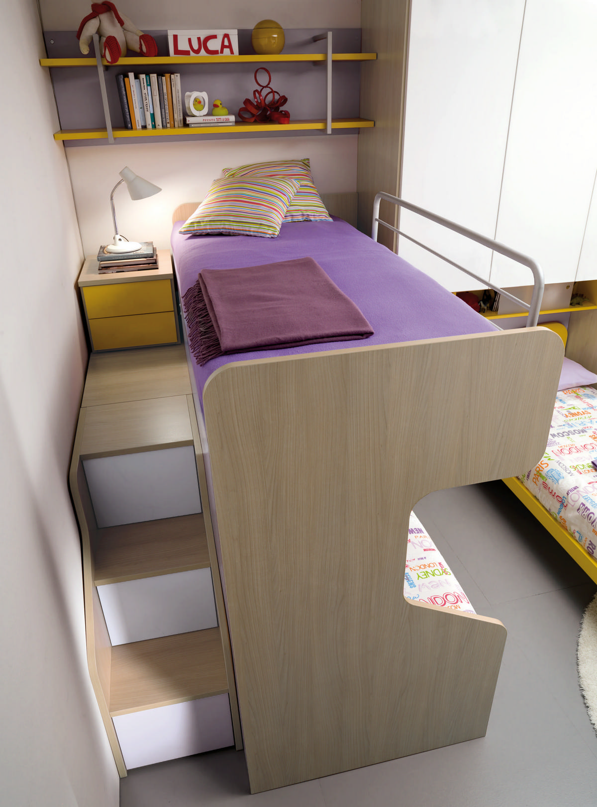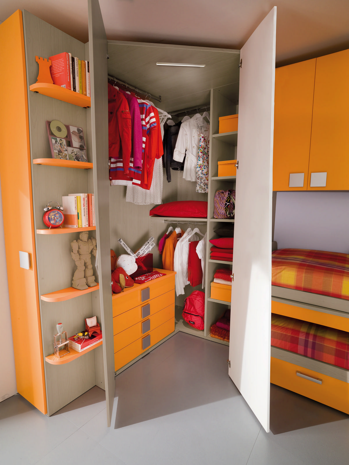 I letti si trasformano: diventano più grandi, contenitori, con possibilità di estrarre un secondo letto per un pigiama party con gli amichetti. Tutto è studiato per accompagnare il bambino nella transizione verso una crescente autonomia: dal riporre i vestiti all’organizzare la cartella.