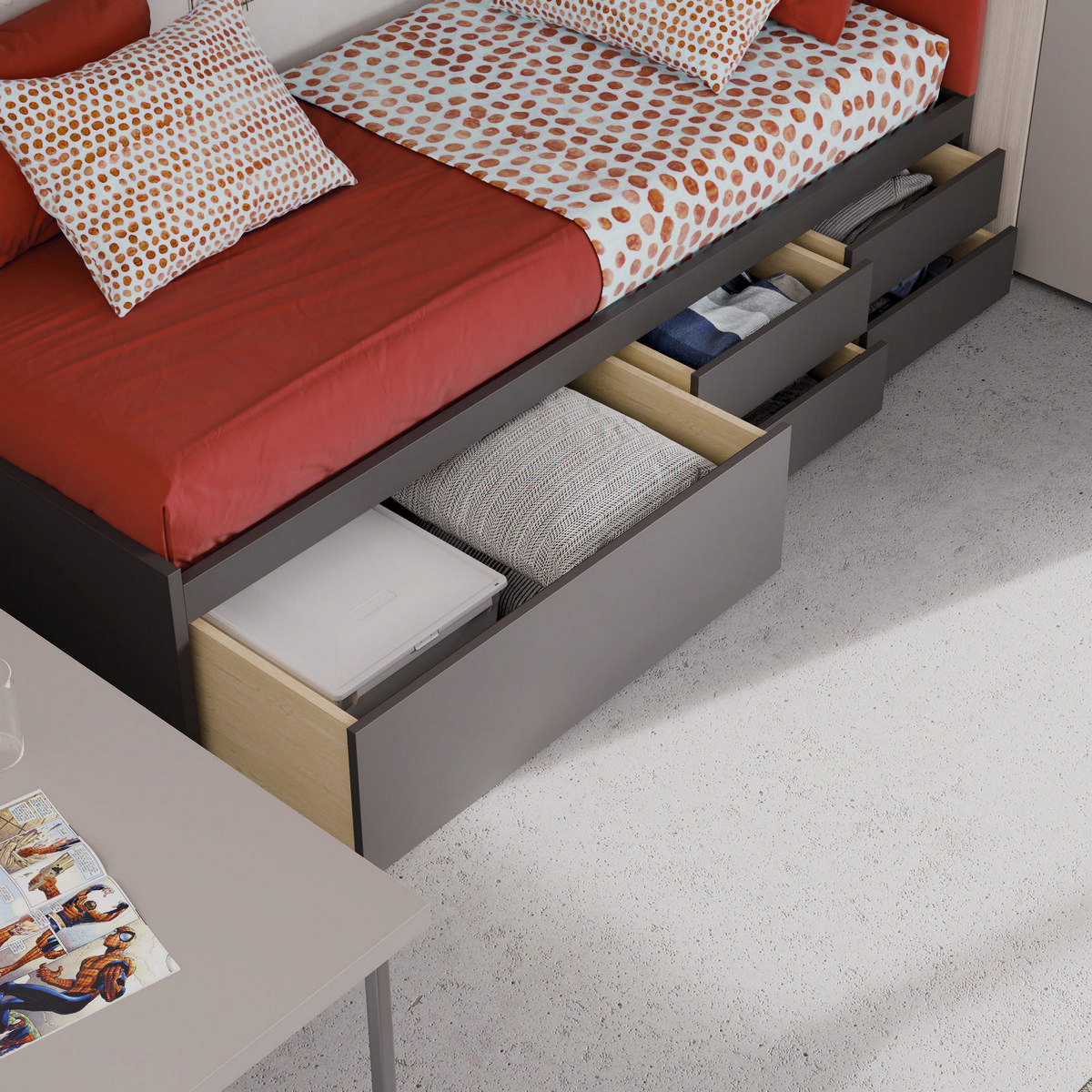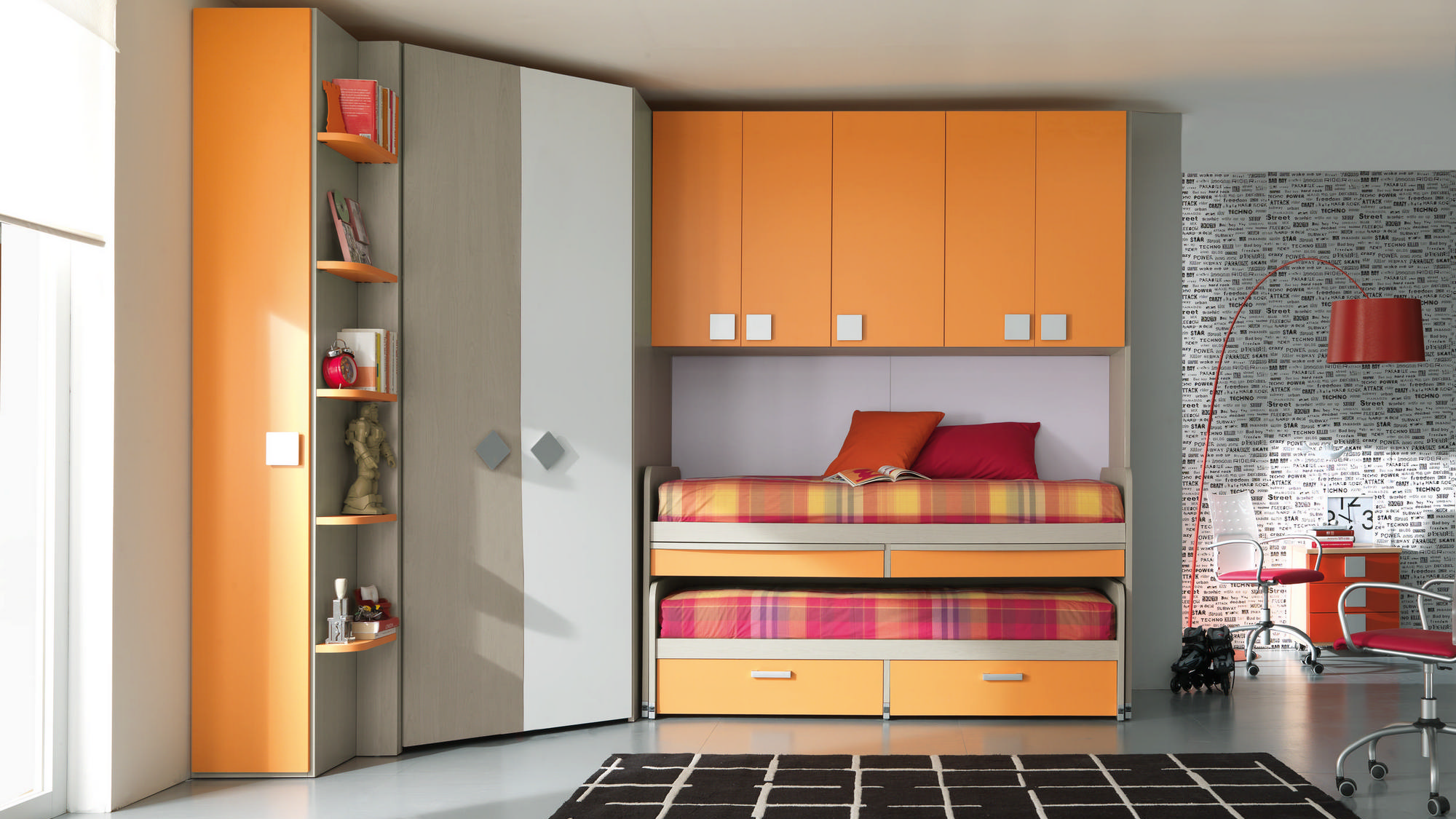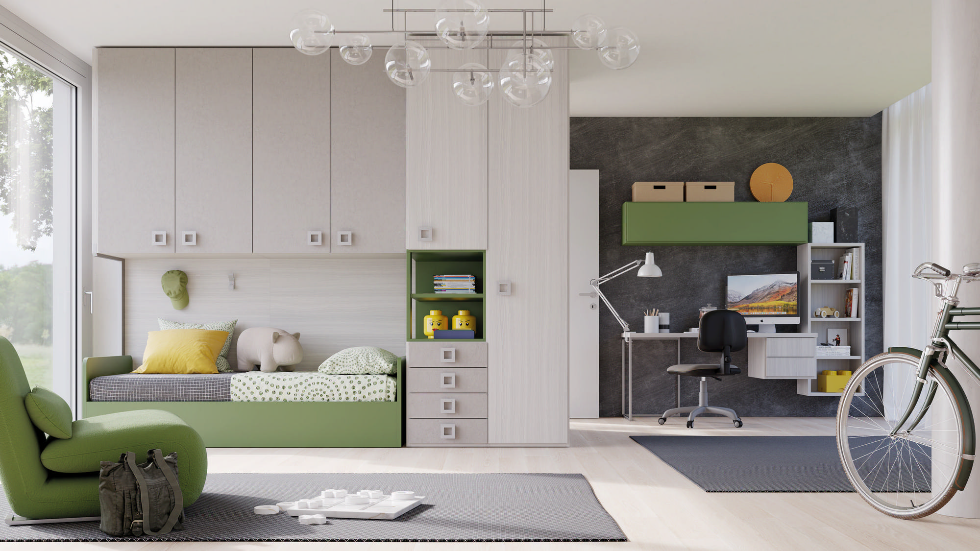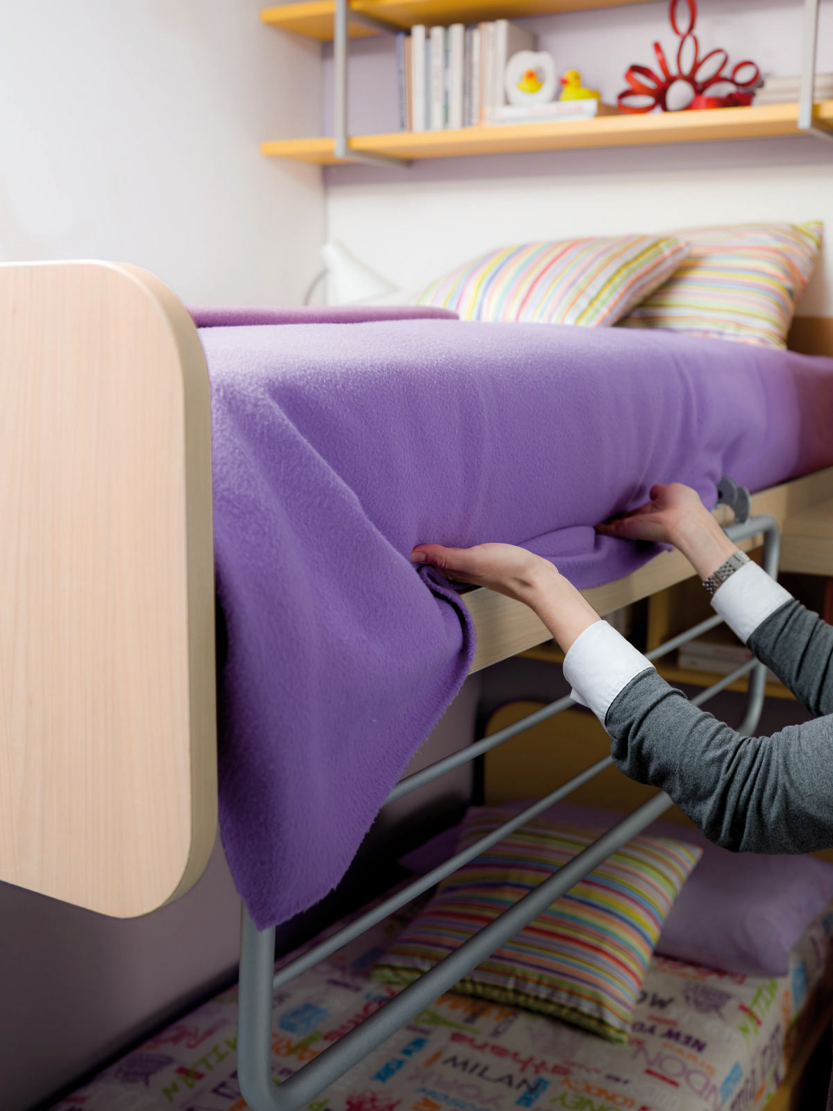I letti si trasformano: diventano più grandi, contenitori, con possibilità di estrarre un secondo letto per un pigiama party con gli amichetti. Tutto è studiato per accompagnare il bambino nella transizione verso una crescente autonomia: dal riporre i vestiti all’organizzare la cartella.
