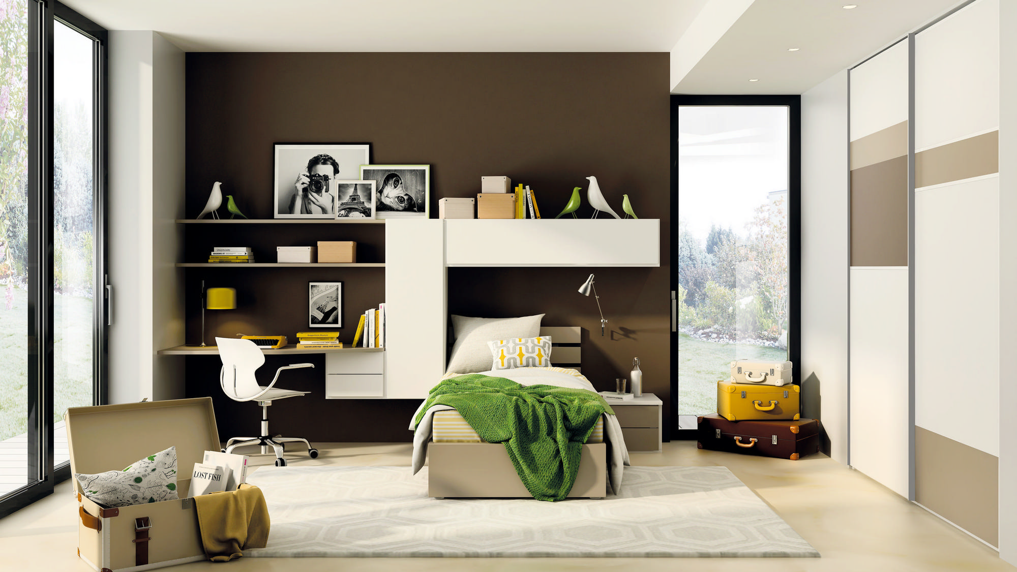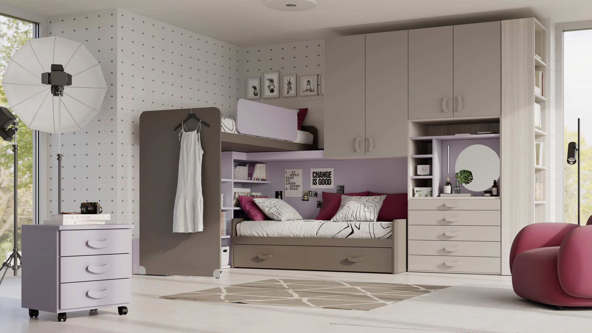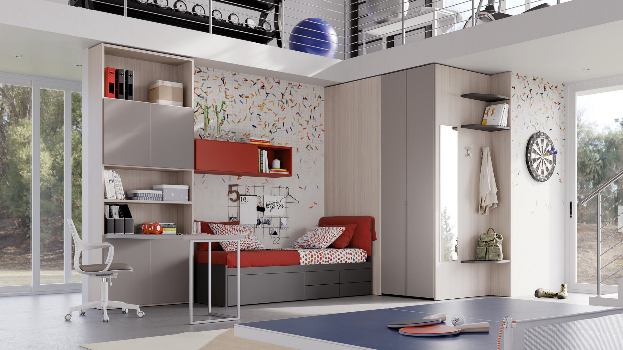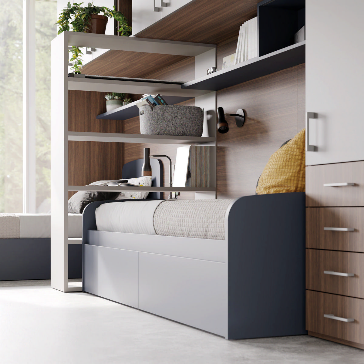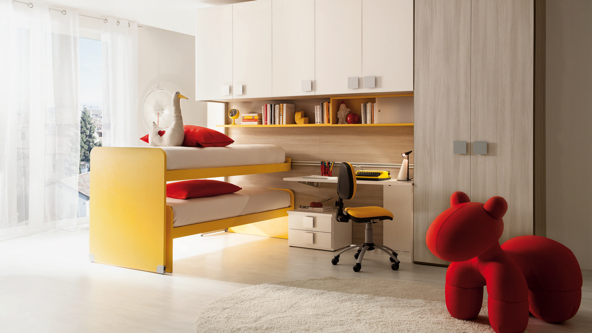 I letti si trasformano: diventano più grandi, contenitori, con possibilità di estrarre un secondo letto per un pigiama party con gli amichetti. Tutto è studiato per accompagnare il bambino nella transizione verso una crescente autonomia: dal riporre i vestiti all’organizzare la cartella.