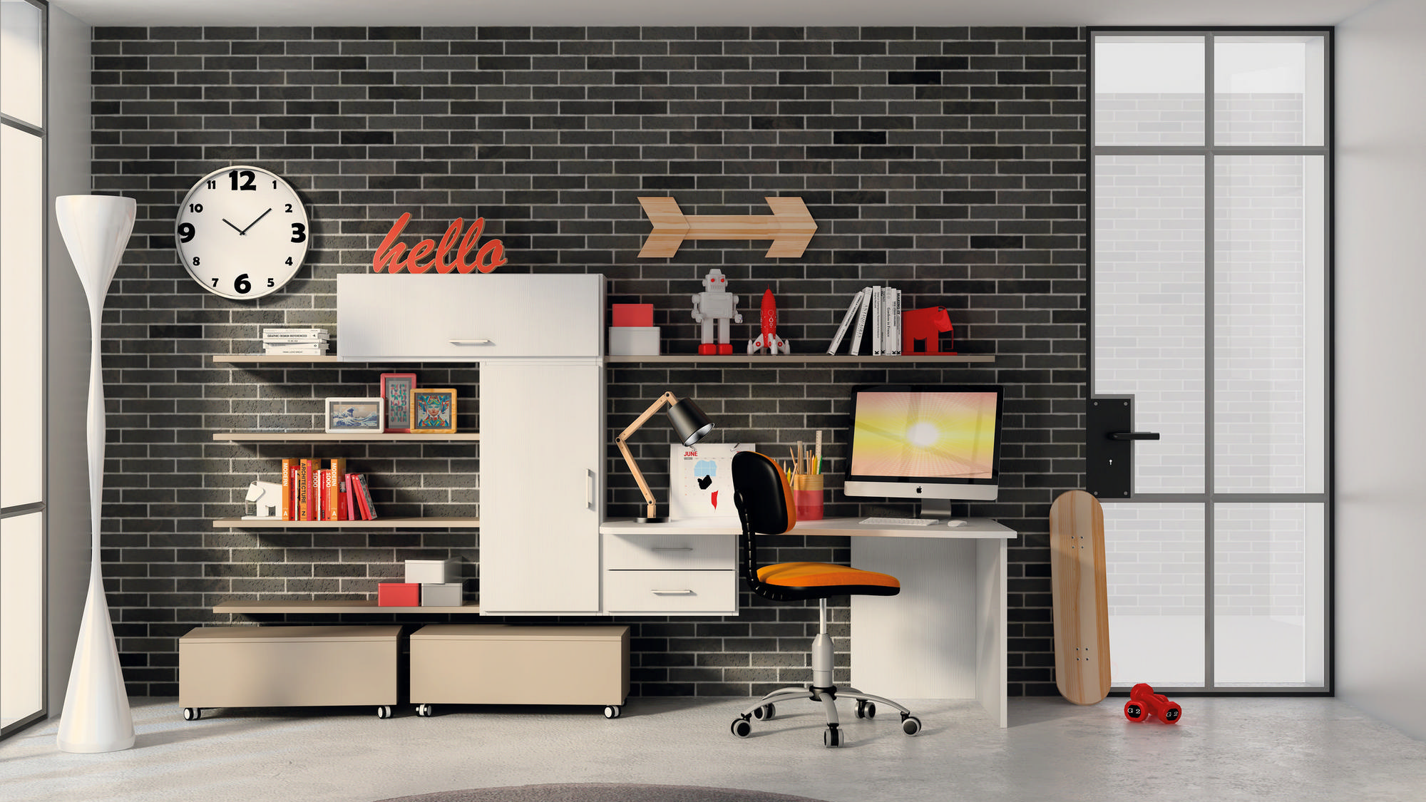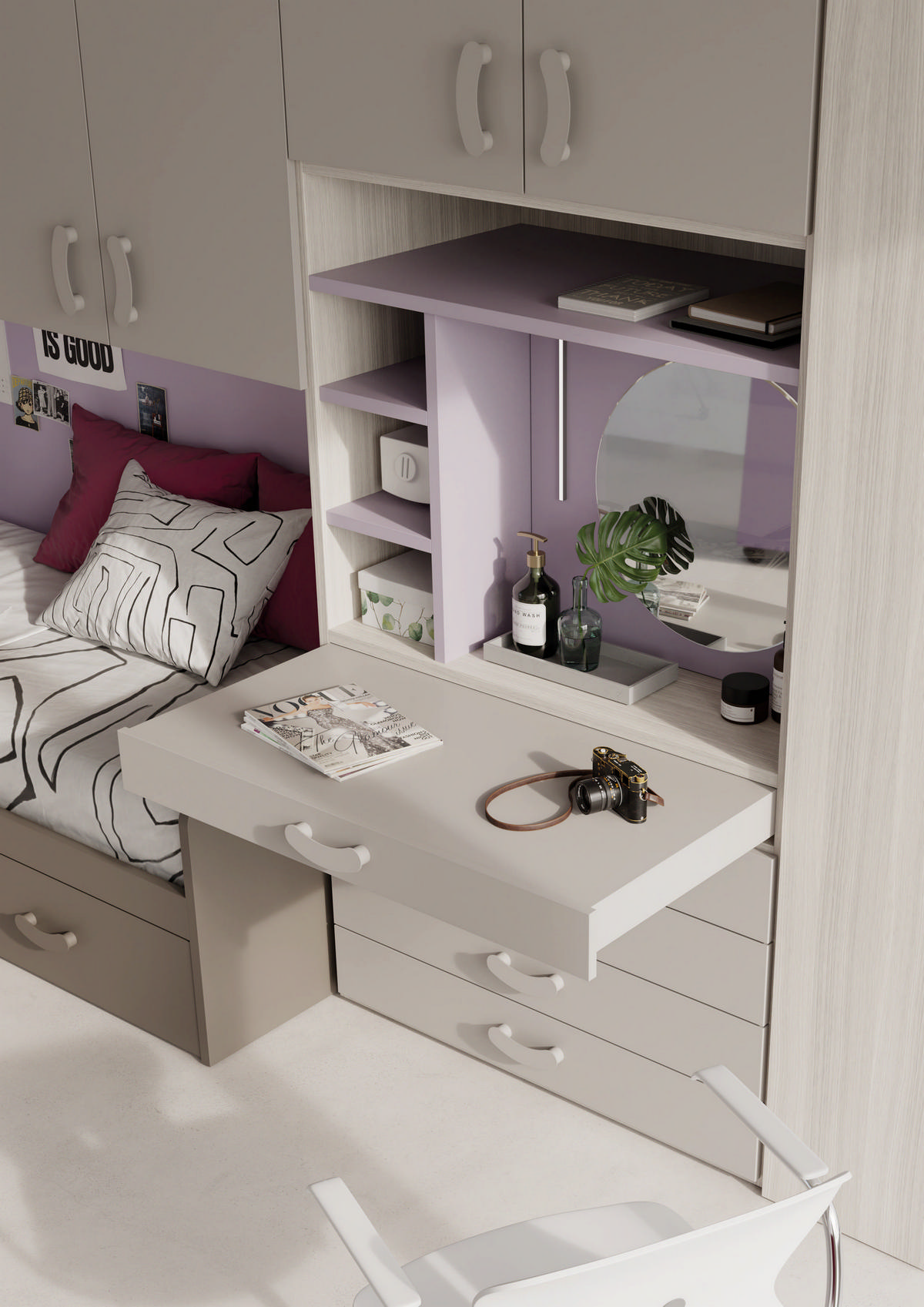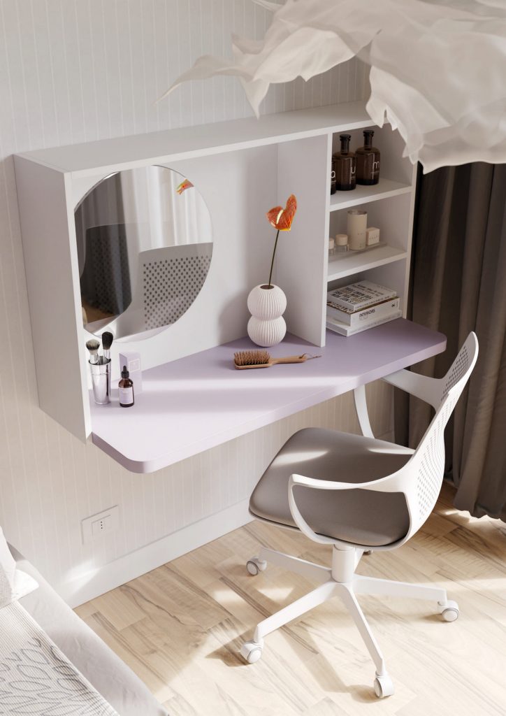 L’illuminazione mirata, il piano di lavoro ben proporzionato e l’organizzazione verticale rendono questa configurazione perfetta per bambini e ragazzi che necessitano di un angolo tutto loro per studiare, disegnare e concentrarsi. Il design è pensato per crescere con loro, offrendo comfort, funzionalità e un’estetica coerente con il resto della cameretta.